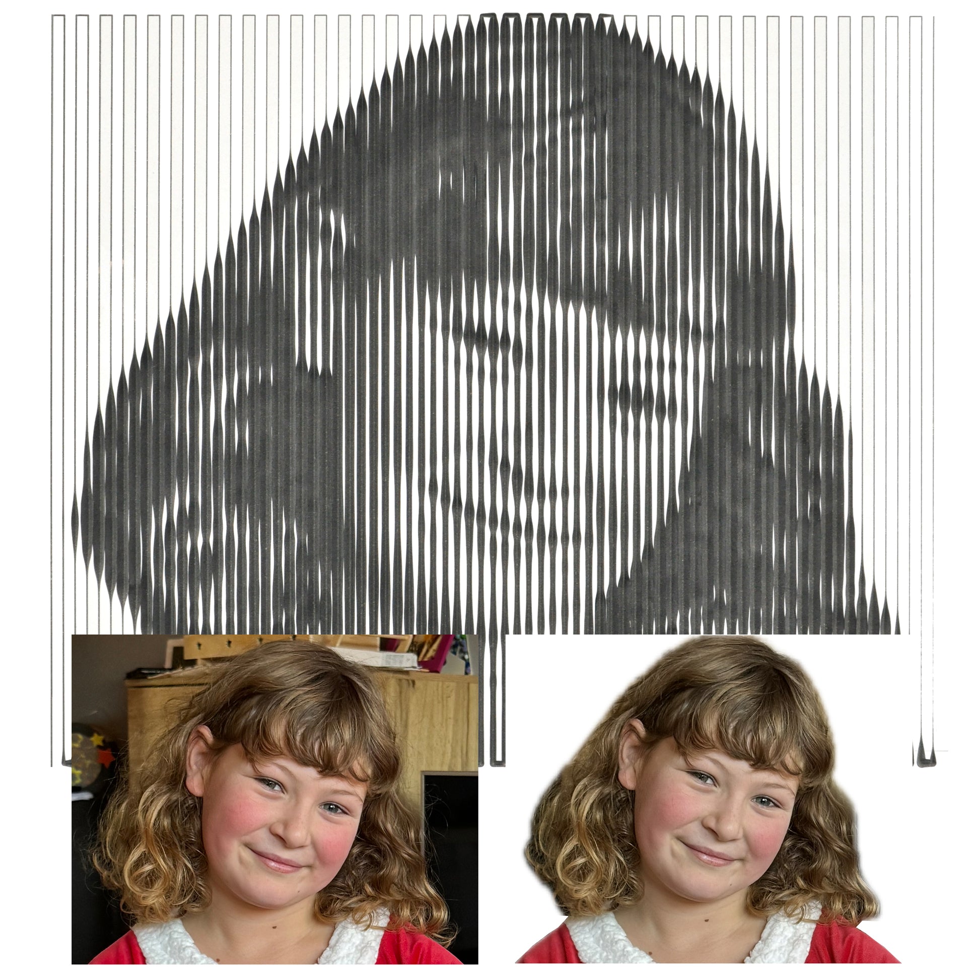 Ja, das ist genau das coole „Foto aus Linien, das man erst aus der Nähe erkennt“ – nur in echt gefräst und nicht nur gedruckt. Viele kennen es schon von TikTok und Instagram als „optische Täuschung aus Holz“ oder „Halbton-Bild fräsen“.